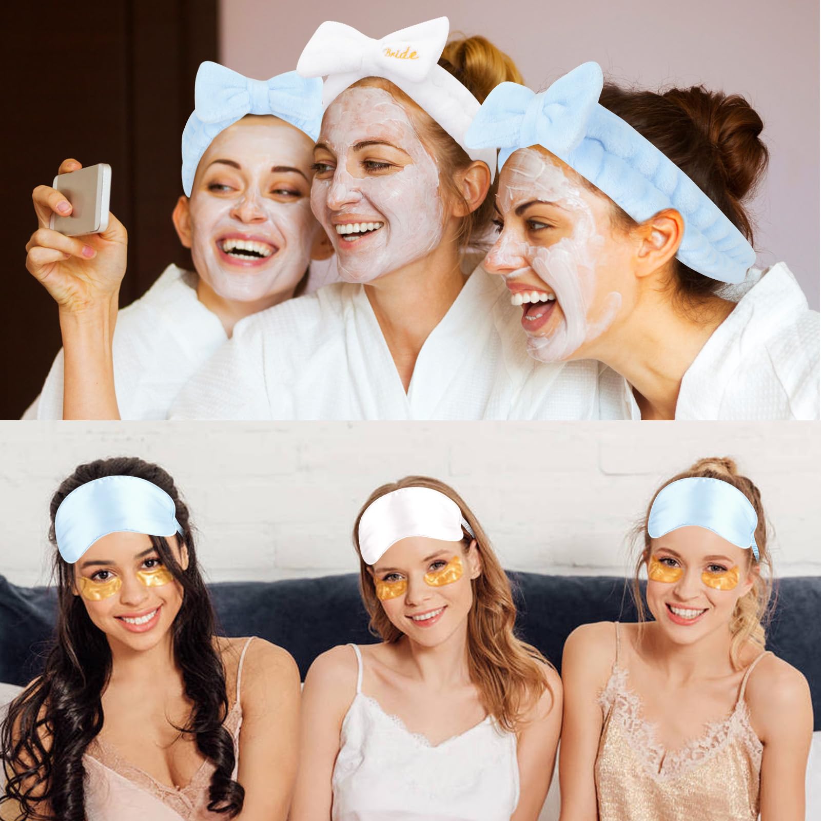Wecoe 12pcs/set Bow Spa Headbands & Eye Masks - Bachelorette Party Favors, Bridal Shower & Bridesmaid Proposal Gifts(White, Blue)—