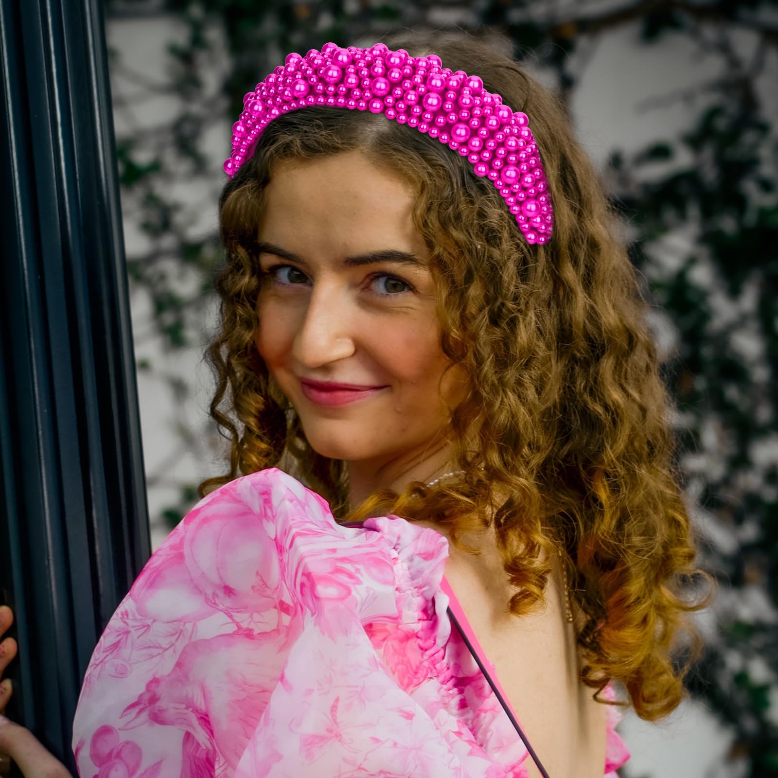 Wecoe 1pc Pearl Headband - Hot Pink Fancy Puffy Headband, Thick Beaded Padded Hair Accessory for Women, Girls, Holiday Gift