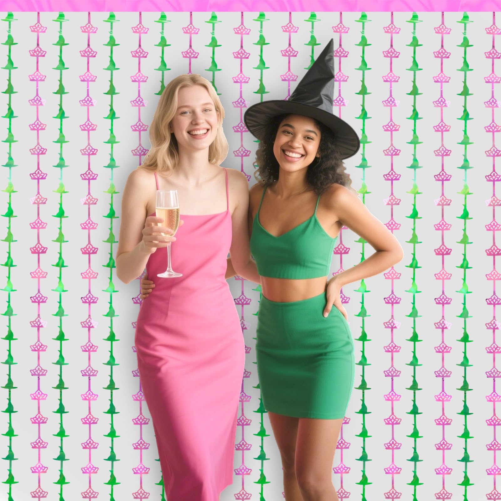 - Dual Themed Design:This set includes two hanging curtains with distinct patterns—one featuring charming crown shapes and the other playful witch hat shapes. Both in vibrant pink and green, they add a mix of royal and whimsical vibes, perfect for diverse themed parties.