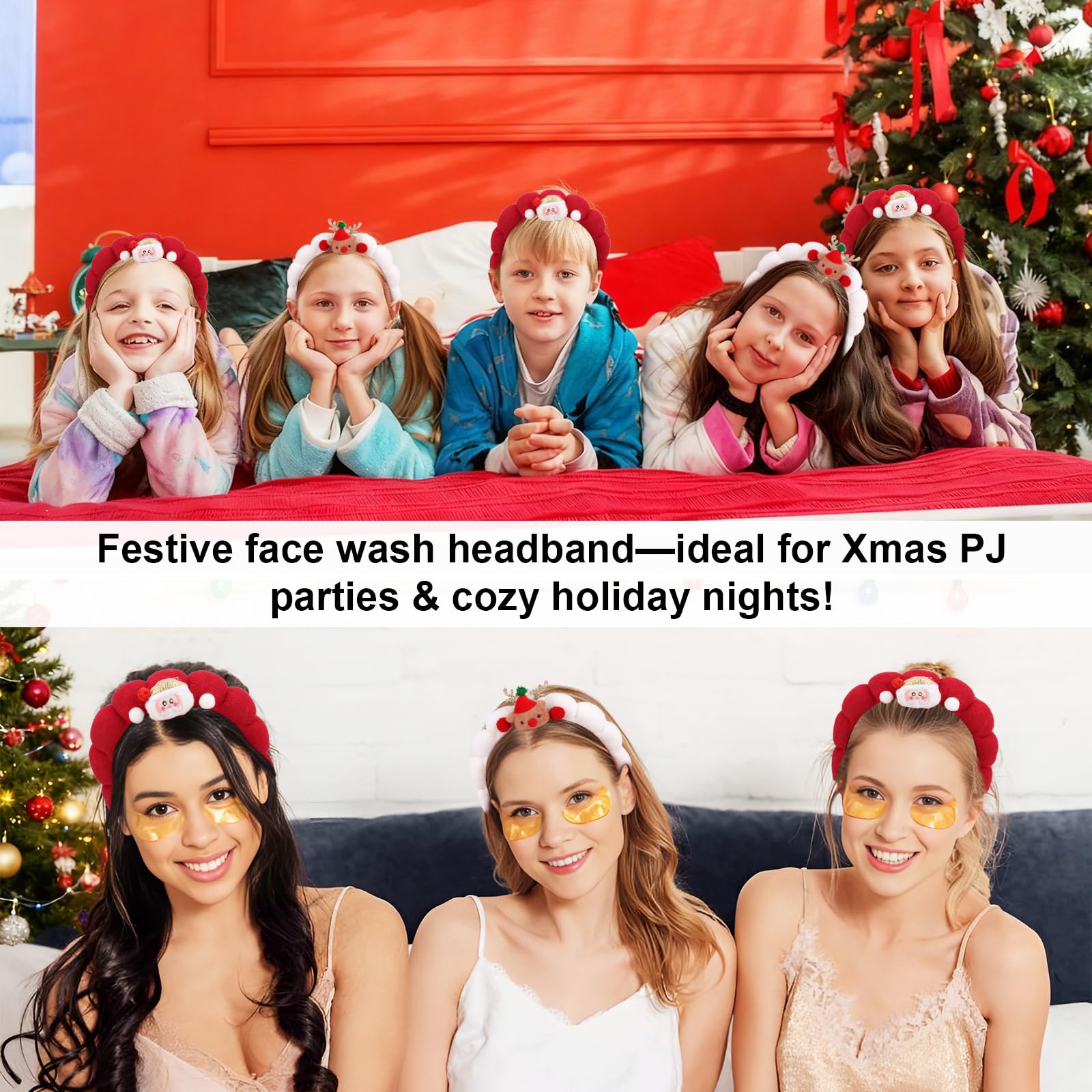 - 2-Pack Festive Christmas Sets: This bundle includes 2 complete sets: 1 white bubble headband (reindeer accent) + matching wristband, and 1 red bubble headband (Santa accent) + matching wristband—doubling holiday self-care options.