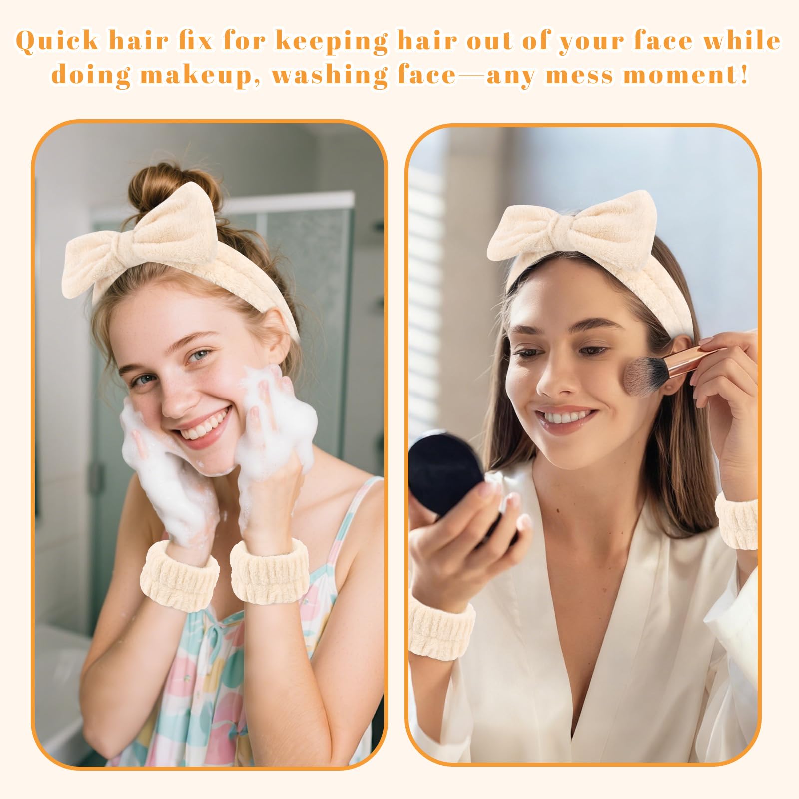 Wecoe Khaki Spa Headband & Wristband Set Makeup Facial Skincare Headbands for Washing Face Get Ready Puffy Bow Tie Hair Band Wristbands Hair Clips Cute Hair Accessories for Women Girls Gifts