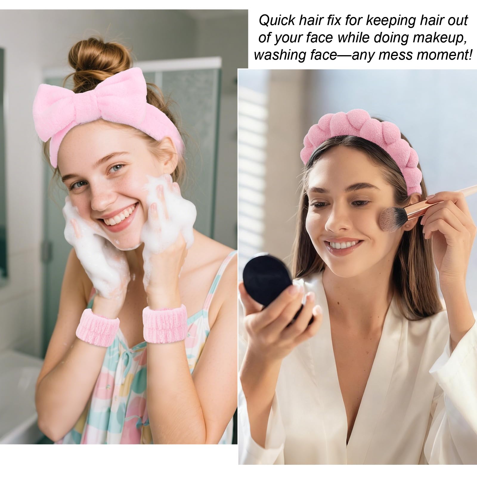 - 5-Piece Pink Self-Care Bundle: This set includes 1 braided bubble headband, 1 bow face wash headband, 1 large hair clip, and 1 pair of wristbands—covering all your get ready headband and face washing accessories needs in one.