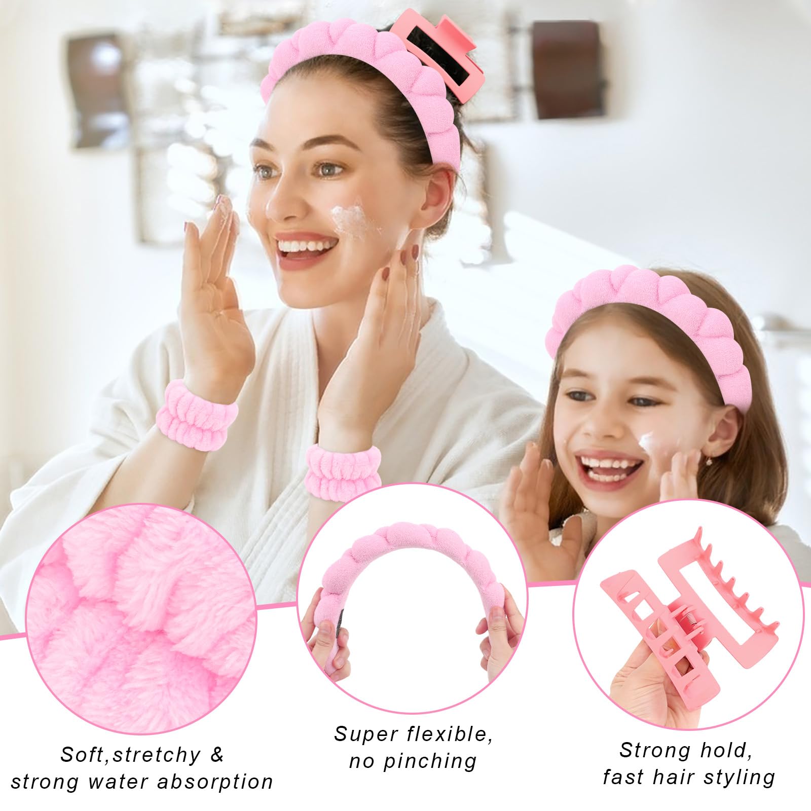 Wecoe Spa Set - Makeup Headband & Wrist Towels, 4 inch Hair Claw Clip, Cute Pink Puffy Sponge Bubble Headband